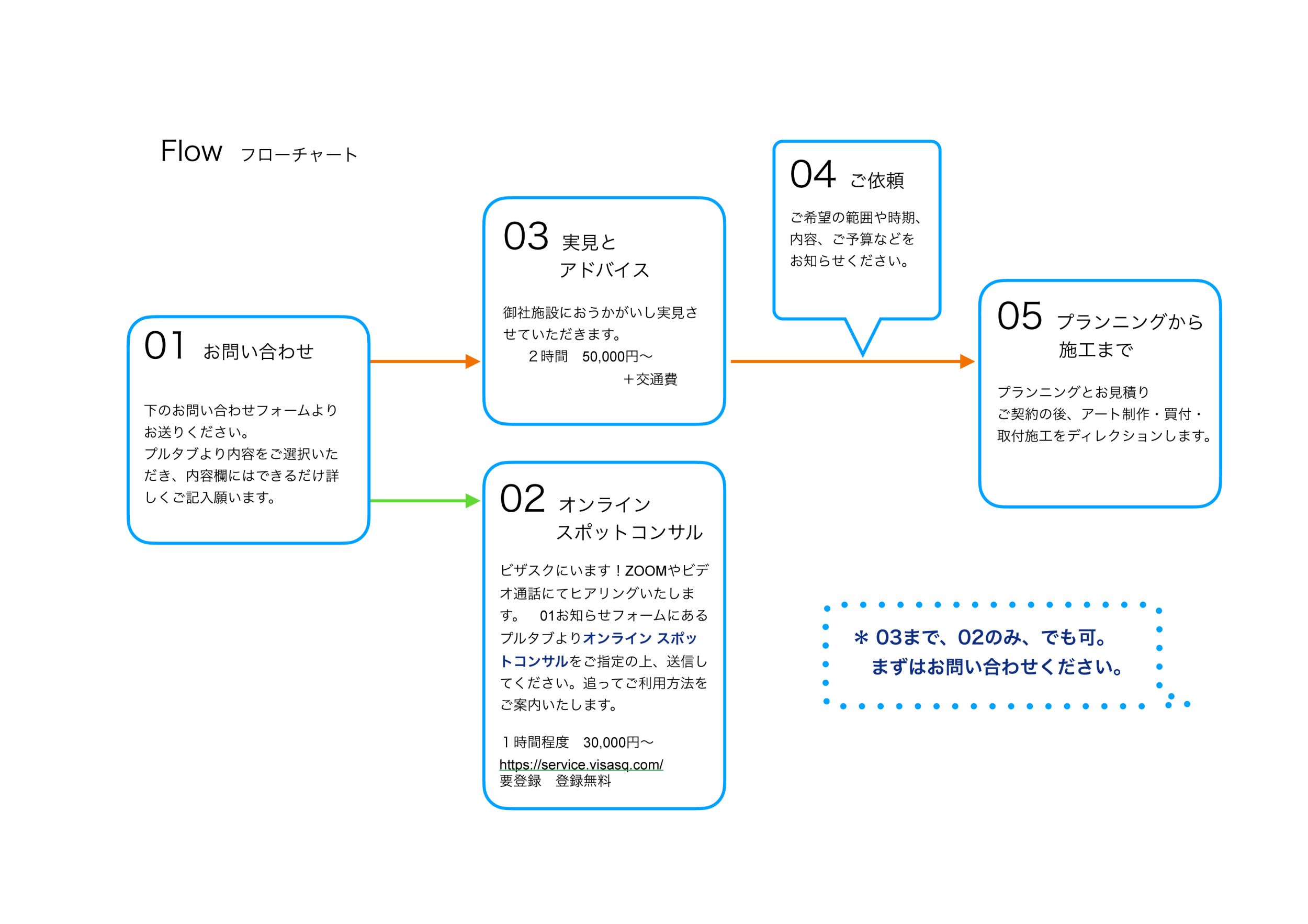 新規アートの制作と現場での取付、ディスプレイ作業をディレクションします。コーディネーターや塗装、大工など職人を必要に応じてセレクトしチームを組んで施工いたします。